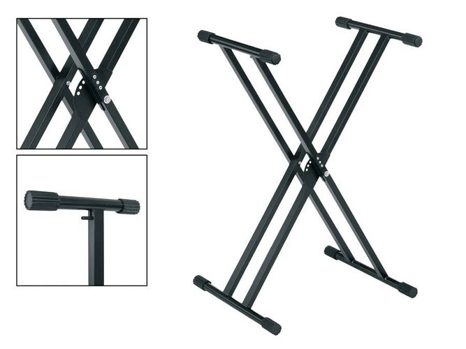 Erittäin tukeva tuplarautainen teline kosketinsoittimelle, liipasinlukolla.